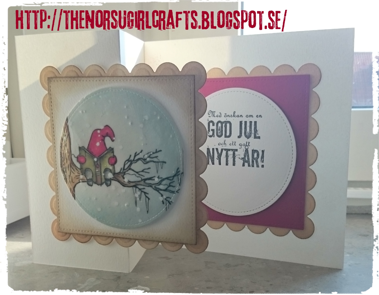 Här är ett s- eller z-vikt kort som jag dekorerat med en söt liten tomtestämpel. Jag har maskat in den läsande tomten i ett träd :).