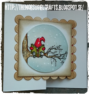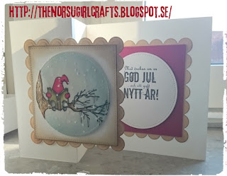 Jag har monterat den på en utstansad kvadrat med falsk söm och slutligen monterat den på en utstansad kvadrat med s k scallopkant (den minsta formen ur grand nestabilities-paketet från Spellbinders. Jag har färgat in kanterna på den största kvadraten med vintage photo distress-färg (liten dyna och ett s k blending tool).