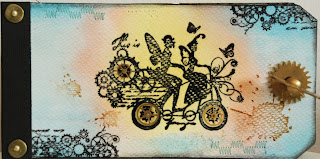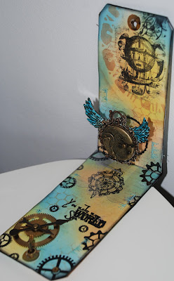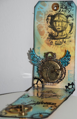 I made the background with distress ink.Embosset motifs and text with black embossing powder and clear utee.Used Sizzix dies pop up poincon.This is cut out of clear plastic..Metal decorations from old clock part.