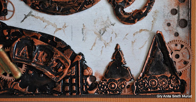 V685 vimplar kit og stemplet i varm utee og alfabet V724 for å lage der det står ART.Brukt bronsje tannhjul i metall som pynt.