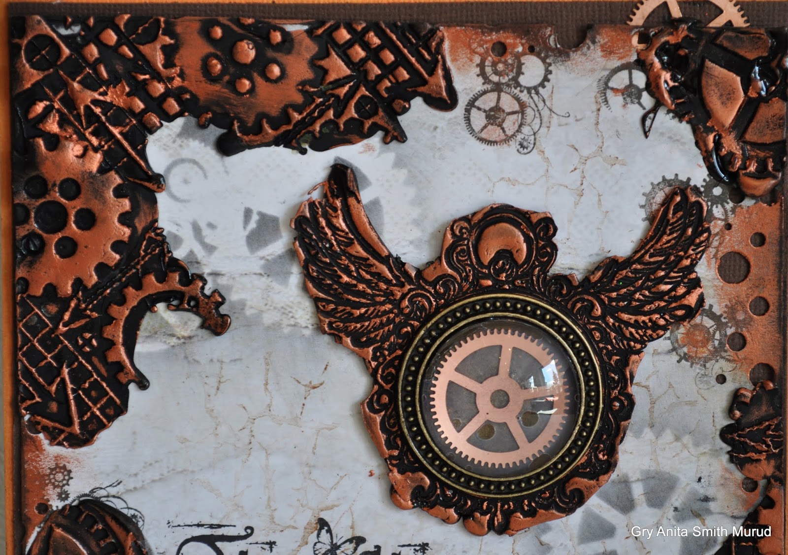 Har brukt svart utee, vildastempler , tekture trades plate graphic gears fra Tim Holtz og tannhjul stencil til å lage bakgrunnen.Jeg har stemplet i varm utee med stemplene og tekture trades platen, for å lage alt som er i bronsje