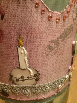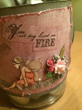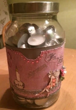 Har gjort en liten “maggördel” åt glasburken som vi har värmeljus i. Stämplar som jag använt är från kitet Jul 2011 V696 och Embla V50 Du lyser upp min tillvaro V482 och You set my heart on fire V441